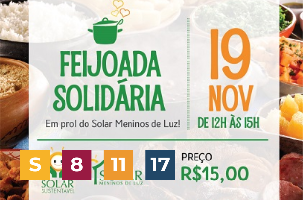 No dia 19 de novembro, domingo, das 12h às 15h, será realizada a segunda edição da Feijoada Solidária, uma iniciativa em prol do Solar Meninos de Luz. O evento será no complexo esportivo do Solar, na Rua Saint Roman, 146, quadra coberta. A Feijoada será preparada por mães de alunos do Solar, que tiveram a […]